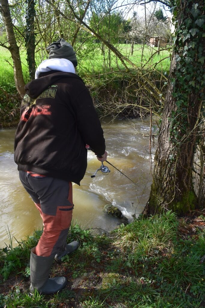 Bruno, que nous accompagnons, nous prévient : il a beaucoup plu la veille. L’eau de la petite rivière de l’Esves a donc grimpé et est agitée, ce qui ne va pas faciliter la pêche. Les poissons restent au calme, et en plus on vient un petit peu tard. À 9h30 du matin, il est possible que ce soit déjà l’heure de la sieste pour nos amis qui vivent sous l’eau !